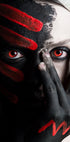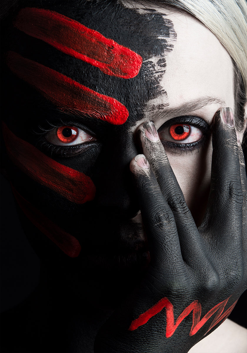 Questo intenso ritratto mostra una donna con sorprendenti occhi rossi e una drammatica pittura sul corpo in tonalità infuocate. Tratti neri e rossi sul viso e sulle mani evocano la potenza cruda del fuoco e uniscono la fotografia figurativa all'arte simbolica. Un’opera d’arte audace e accattivante che irradia passione, forza e intensità.