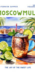 Questo vivace poster mostra un rinfrescante Mosca Mule servito in una tazza di rame, accompagnato da lime freschi e una piscina sullo sfondo. Con colori forti e un'atmosfera estiva, cattura la gioia degli agrumi, della freschezza e del relax: un'opera d'arte perfetta per cucine, bar o pareti panoramiche ispirate all'estate.