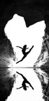 Questa sorprendente opera d'arte in bianco e nero mostra una ballerina che salta con grazia all'interno di una grotta a forma di cuore, con il suo riflesso riflesso nell'acqua immobile. La silhouette drammatica unisce danza, natura e romanticismo e crea una potente espressione visiva di passione, eleganza e bellezza artistica senza tempo.