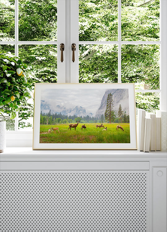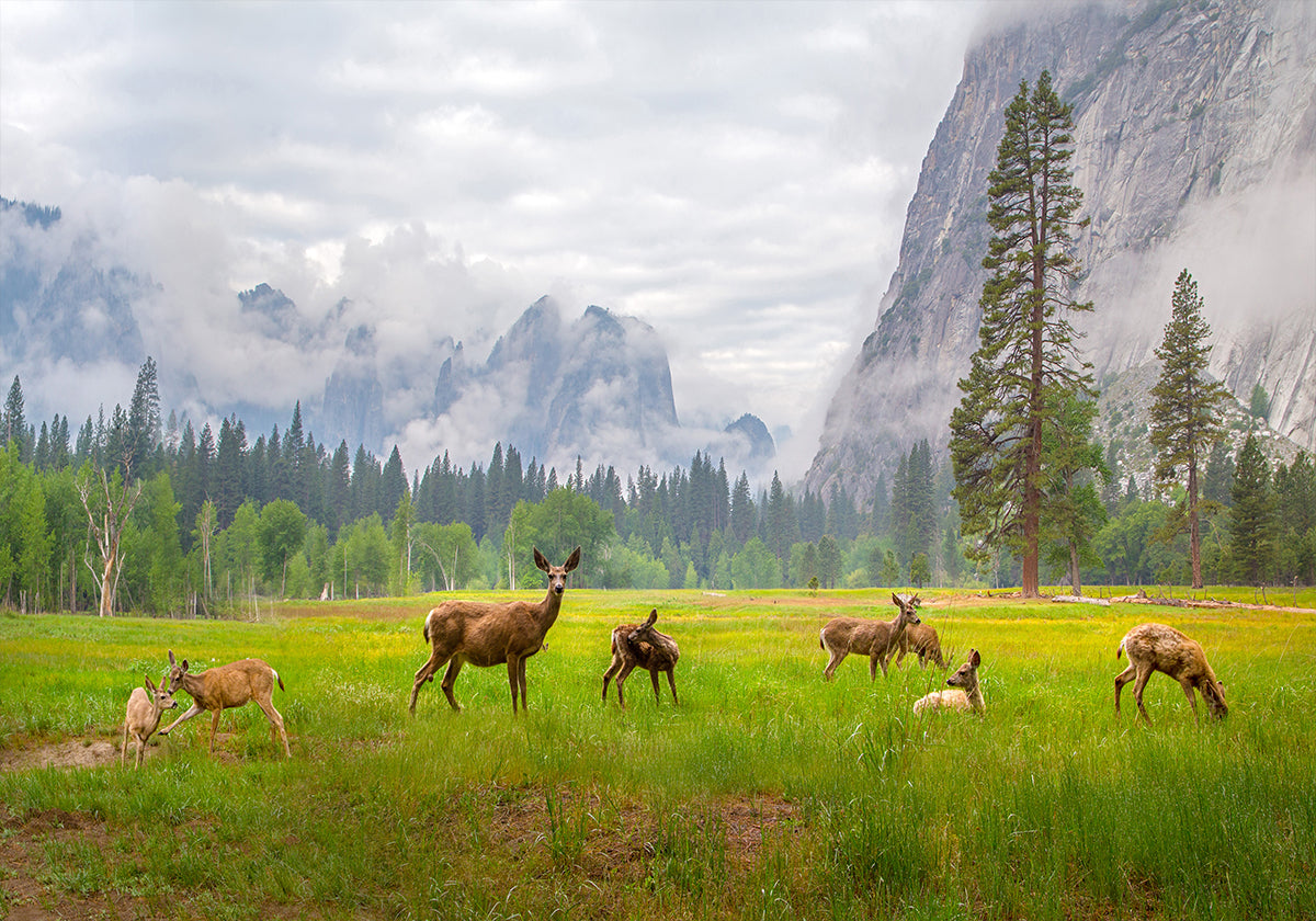 I caprioli vanno alla deriva attraverso un prato nebbioso dello Yosemite, le corna catturano il primo oro dell'alba mentre pini torreggianti e scogliere lontane si innalzano come guardiani. Una silenziosa processione della natura selvaggia, questa scena evocativa di Dianne Mao invita a una pausa senza tempo, dove la valle, la foresta e la mandria respirano in un'antica armonia. Inspira il silenzio.