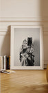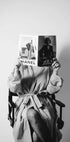 Una sofisticata fotografia in bianco e nero di una donna in trench e collant a pois che sorregge riviste di moda con Chanel ed Elle. L'opera d'arte trasuda stile senza tempo ed eleganza parigina, perfetta come pezzo di tendenza in interni moderni e attenti alla moda.