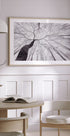 Questa suggestiva opera d'arte in bianco e nero mostra la vista dal suolo della foresta, verso gli alti tronchi degli alberi e i rami sottili che scompaiono nella nebbia. La composizione mescola mistero, tranquillità e geometria della natura e crea un'opera senza tempo che evoca il silenzio e la silenziosa bellezza della foresta.
