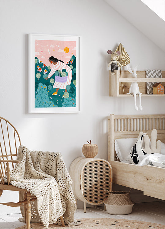 A Woman Tree Picking di Bea Müller - Carta di qualità premium con una superficie liscia e opaca e una sensazione elegante. La finitura opaca riduce i riflessi e dona un look raffinato e senza tempo. Robusto e durevole per un uso duraturo, ideale sia per ambienti professionali che per espositori decorativi.