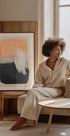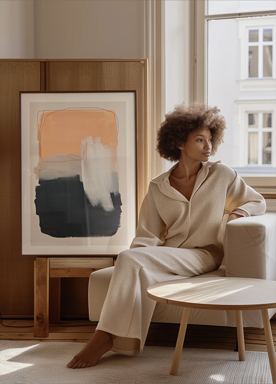 Un poster astratto moderno con pennellate audaci in pesca calda, grigio stratificato, nero profondo e un tocco di bianco tenue. I tratti strutturati e i toni contrastanti creano una composizione sorprendente che bilancia calore e profondità, perfetta per interni minimalisti, decorazioni scandinave o eleganti pareti di gallerie.
