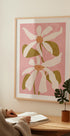 Questa moderna opera d'arte floreale astratta presenta eleganti fiori bianchi con morbidi petali e foglie verde terra su un caldo sfondo rosa pastello. Minimalista ma espressiva, l'opera unisce la bellezza botanica con l'illustrazione moderna, aggiungendo freschezza e fascino a qualsiasi interno.