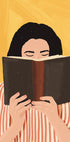 Un'illustrazione calda e invitante di una donna profondamente assorta in un libro, su uno sfondo giallo intenso. La camicia a righe e i toni della terra aggiungono un fascino accogliente e moderno, perfetto per angoli lettura, biblioteche o qualsiasi spazio che celebra la gioia dei libri.