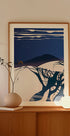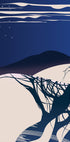 Si svolge una tranquilla notte invernale: alberi snelli e spogli si stagliano oscuramente contro un cielo profondo e stellato, mentre una grande luna sorge sopra montagne lontane. Il minimalismo di ispirazione giapponese incontra l'atmosfera da sogno in un motivo che bilancia calma, mistero e poesia cosmica - perfetto come eye-catcher meditativo.