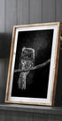 Una straordinaria fotografia in bianco e nero di un gufo appollaiato su un ramo, con occhi penetranti pieni di mistero. I toni monocromatici evidenziano ogni piuma e ombra, creando un ritratto drammatico e discreto che incarna l'essenza della fauna selvatica, della notte e dello spirito selvaggio della natura.