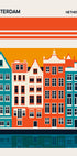 En stilren rejseplakat af Amsterdam: smalle kanalhuse med gavle spejler sig i det stille vand, indrammet af en varm beige baggrund. Grafiske linjer og retro farver skaber en nostalgisk storbystemning, mens typografien med bynavn og koordinater giver et elegant, moderne præg til væggen. Perfekt til hjem eller kontor.
