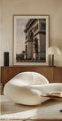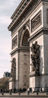 A detailed photographic print of the Arc de Triomphe in Paris, showing the monumental sculptures, inscriptions and neoclassical design. Catturata dal livello della strada con le persone ai piedi, l'opera d'arte evidenzia sia la grandiosità del punto di riferimento che il suo posto nella vita quotidiana della città.