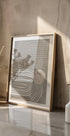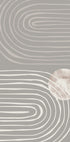 Un poster astratto minimalista con motivi a linee arcuate fluide in beige tenue su uno sfondo grigio tenue, evidenziato da un cerchio strutturato. La geometria organica dona un'espressione calma ed equilibrata, ideale per interni giapponesi, nordici o moderni e minimalisti.