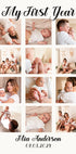 Un bellissimo poster personalizzato per celebrare il primo anno di vita del tuo piccolo. Questa stampa collage fotografico cattura dodici ricordi preziosi, dai momenti appena nati ai primi traguardi. Un ricordo senza tempo e il regalo perfetto per genitori, nonni o per l'arredamento della cameretta.