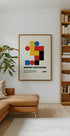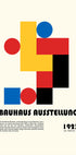 Un caratteristico poster della mostra Bauhaus del 1923 con audaci forme geometriche in rosso, blu, giallo e nero. Questo design di ispirazione vintage rende omaggio al movimento Bauhaus con forme astratte, linee pulite e un layout minimalista. Un pezzo senza tempo di art deco e storia del design modernista.