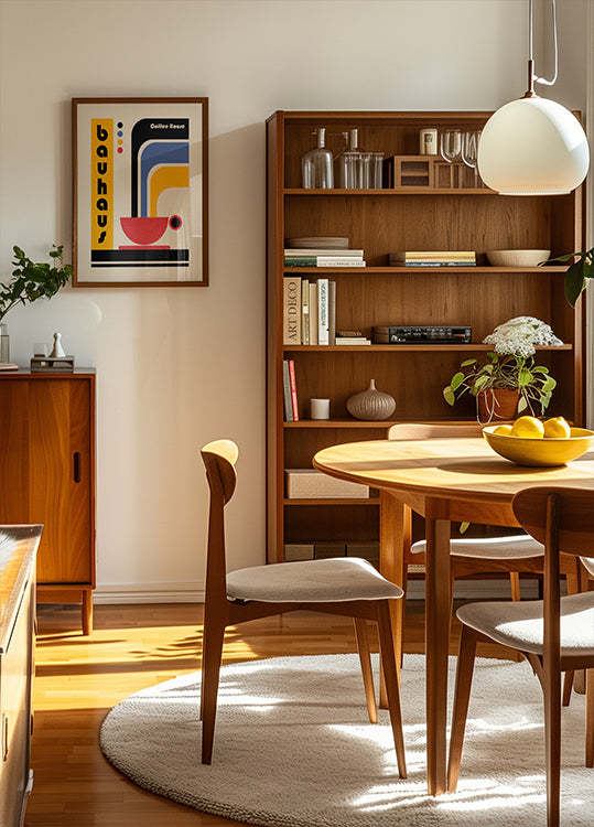 Un poster di un caffè ispirato al Bauhaus con audaci forme geometriche in rosso, giallo, blu e nero. Il disegno astratto mostra una tazza di caffè fumante in puro stile Bauhaus, che unisce funzionalità e semplicità artistica. Decorazione da parete perfetta per cucine retrò, caffè e amanti del modernismo vintage.