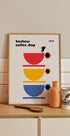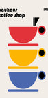 Un poster di una caffetteria ispirato al Bauhaus del 1919 con tre tazze impilate in rosso, giallo e blu in audaci forme geometriche. Minimalista ma vivace, questo design esprime lo spirito artistico del modernismo e della cultura del caffè. Decorazione da parete perfetta per cucine, caffetterie e amanti dello stile Bauhaus.