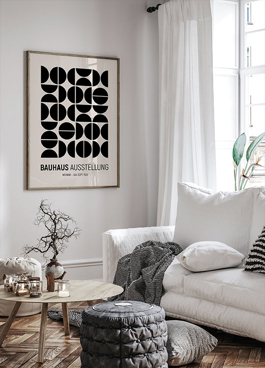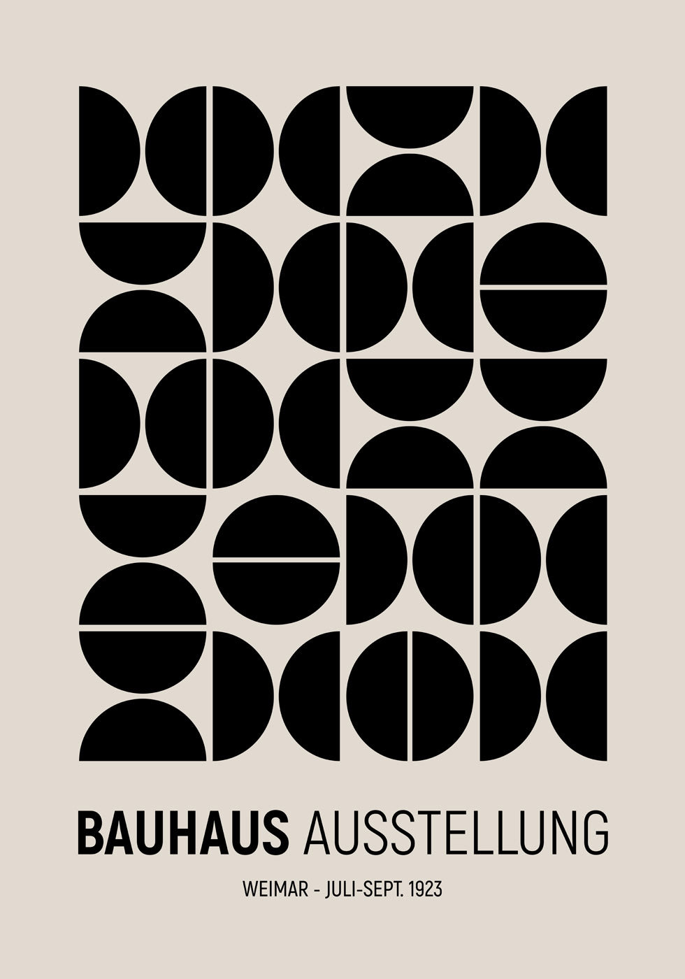 Ispirato alla mostra Bauhaus del 1923, questo poster grafico mette in mostra la bellezza della semplicità con forme nere disposte in file sistematiche. Un omaggio visivo al movimento modernista.