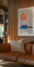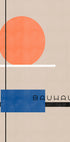 Un poster minimalista ispirato al Bauhaus con forme geometriche audaci, tra cui un grande cerchio arancione e un rettangolo blu audace su sfondo beige. Linee rette e contrasti semplici rendono quest'opera d'arte un elemento senza tempo sia negli interni moderni che in quelli vintage.