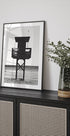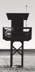Una sorprendente fotografia costiera in bianco e nero che mostra una torre del bagnino che si erge sulla spiaggia. I forti contrasti enfatizzano la struttura geometrica della torre contro il calmo orizzonte marino. Un'opera d'arte minimalista ma potente, perfetta per interni moderni dal look costiero o monocromatico.