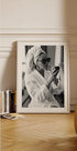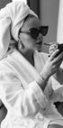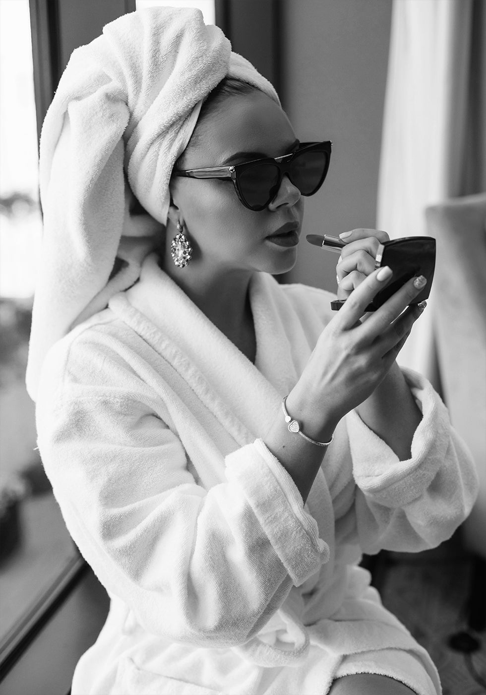 Una sofisticata fotografia in bianco e nero di una donna in accappatoio con un asciugamano intorno alla testa mentre si applica il rossetto, occhiali da sole e gioielli di tendenza. Questa elegante opera d'arte celebra la bellezza dei piccoli rituali e il glamour senza tempo, perfetto per interni ispirati alla moda.
