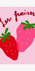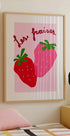 Un poster di fragole giocoso e vivace con forti sfumature rosse e rosa e testo francese scritto a mano "Les fraises". Perfetto per l'arredamento retrò della cucina, ispirazione per San Valentino o per chi ama l'arte della frutta.