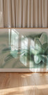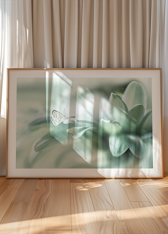 Una bella fotografia macro di una farfalla che riposa dolcemente accanto a una scintillante goccia d'acqua su morbidi petali verdi. Con colori pastello e uno sfondo sfocato da sogno, quest'opera d'arte cattura la fragilità, la purezza e la silenziosa bellezza della natura.