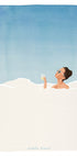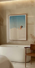 Un'elegante illustrazione di una donna che si gode una vasca idromassaggio sotto un cielo azzurro, con in mano un bicchiere di vino. Il design minimalista e i tenui colori pastello creano un'atmosfera calma e lussuosa, perfetta per le stanze relax o come decorazione elegante.