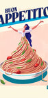 Un poster allegro e giocoso di ispirazione italiana con la frase sorprendente Buon Appetito. Mostra una donna il cui vestito scende da una montagna di spaghetti con pomodoro e basilico, un divertente mix di cultura alimentare e illustrazione in una vivace opera d'arte.