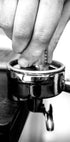 Un sorprendente poster del caffè in bianco e nero con un primo piano della mano di un barista che preme il caffè appena macinato in un portafiltro. Perfetto per gli amanti del caffè, i bar e le pareti della cucina, questo design monocromatico minimalista cattura l'arte della preparazione dell'espresso.