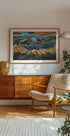 Una vista aerea mozzafiato del paesaggio desertico della California, che mostra i corsi d'acqua e i delta della natura sopra le dune di sabbia. Gli intricati motivi venati in blu e oro creano un capolavoro astratto, dove terra e acqua si uniscono in armonia. Un sorprendente pezzo d'arte fotografica da parete per interni moderni.
