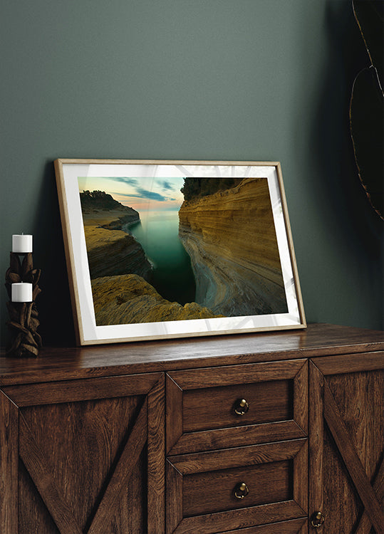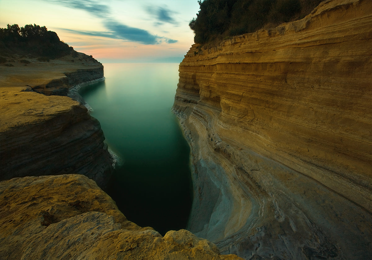 Una serena foto a lunga esposizione dell'iconico Canal d'Amour a Corfù, in Grecia. Le acque color smeraldo sono incorniciate da spettacolari scogliere di arenaria, creando un'atmosfera misteriosa e romantica. Questo paesaggio costiero cattura la bellezza naturale, la tranquillità senza tempo e il fascino leggendario del Mar Ionio.