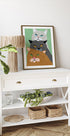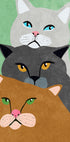 Un'illustrazione audace e moderna di tre gatti stilizzati impilati insieme in un ritratto giocoso. Con baffi espressivi, occhi vivaci e un design grafico colorato, questa opera d'arte è perfetta per gli amanti dei gatti e aggiunge un'atmosfera eccentrica e moderna a qualsiasi stanza.