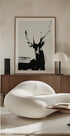 Un ritratto astratto, in bianco e nero di un cervo, realizzato con pennellate forti ed espressive. Il volto e le corna possono essere visti nei tratti grezzi e artistici, che conferiscono al motivo un'espressione drammatica e moderna.