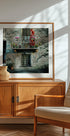 Chains of Gold di ambra cattura un colorato momento urbano: una giovane donna si trova su un balcone in ferro battuto, dove catene dorate si snodano come gioielli contro una facciata sbiadita. Una porta rossa, vasi di fiori e ombre sottili creano un contrasto tra patina urbana ed elegante poesia - un vibrante omaggio all'architettura quotidiana.