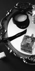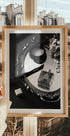 Un'elegante fotografia in bianco e nero dei prodotti di bellezza Chanel, con l'iconico profumo Gabrielle Chanel, un nastro elegante e dettagli raffinati su uno specchio vintage. Questa stampa esprime il lusso e la raffinatezza francesi senza tempo e diventa una dichiarazione elegante in interni ispirati alla moda, alla bellezza e all'eleganza classica.