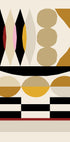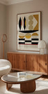 Un caratteristico poster astratto ispirato al Bauhaus con forme geometriche nei toni della terra come ocra, beige e nero, completati da accenti rossi e rosa. Le forme pulite e strutturate creano un sorprendente equilibrio visivo che unisce il minimalismo moderno al design della metà del secolo, perfetto per interni contemporanei o pareti di gallerie di ispirazione retrò.