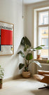 Un'iconica opera d'arte astratta di Piet Mondrian, creata nel 1930. L'opera mostra forti campi di colore in rosso, blu, giallo e bianco, separati da spesse linee nere, che rappresentano lo stile unico di Mondrian di astrazione geometrica ed equilibrio.