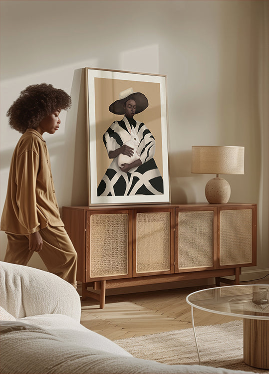 Donna a strisce con in braccio un coniglio bianco (NUOVO)