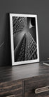 Una scena cittadina monocromatica di Amsterdam con prospettive drammatiche, dove torri e alberi slanciati si protendono verso il cielo. Le linee grafiche e i contrasti netti creano ritmo e calma mentre la luce estiva disegna le facciate. Un'atmosfera moderna e urbana rappresentata dall'artista Willem. Perfetto per gli amanti dell'architettura e della vita cittadina.