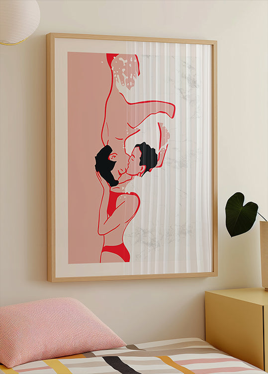 To elskere svæver i et eterisk kys under bølgerne. Lette, flydende linjer og rød-hvide accenter danner en poetisk rytme mellem ro og bevægelse. Den minimalistiske komposition af Kintsugi99 forener havets dybde med intimitet – et drømmende fokuspunkt til soveværelset eller stuen. Perfekt til gallerivægge og romantiske hjørner.