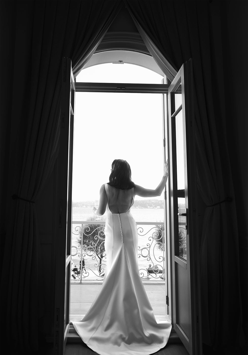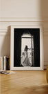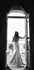 Una splendida fotografia in bianco e nero che cattura l'eleganza di una donna in un abito fluido che si affaccia da un balcone. La composizione evidenzia la grazia senza tempo, lo stile raffinato e la bellezza calma, rendendola un'opera d'arte perfetta per interni che celebrano la moda, il romanticismo e la raffinatezza.