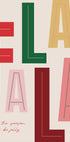 Canta ad alta voce: Fa La La in caratteri giubilanti e impilati irrompe sulla pagina con accenti rosso agrifoglio, verde pino, rosa bacche e dorati. Questo giocoso design tipografico incanala il classico canto natalizio, portando energia moderna e festosa nei corridoi, sui caminetti e sulle pareti delle gallerie: gioiose, luminose, inconfondibilmente festive. Lascialo cantare sul tuo muro.