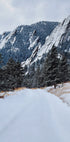 Un tranquillo momento invernale dagli iconici Flatirons di Boulder: un sentiero innevato nel Chautauqua Park conduce verso le scogliere frastagliate, mentre i pini verde scuro e la leggera nebbia creano un'atmosfera fresca e cupa. Su tutto incombe un cielo nuvoloso e la calma della natura è quasi udibile. Fotografia di Del Mundo Imagery.