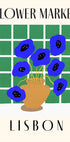 En solrig hyldest til Lissabons blomsterboder: stiliserede vilde blomster i en grafisk vase, sat mod en harmonisk farvepalet af blå, grøn og varme nuancer. Retro typografi med teksten “Flower Market Lisbon Portugal” giver plakaten en nostalgisk markedsstemning. Illustration af Dirkie Nell. Perfekt til en lys, middelhavs-inspireret indretning.