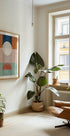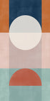 Questo poster geometrico astratto presenta una composizione moderna di cerchi e rettangoli nei toni della terra come terracotta, blu navy, cipria e verde salvia. Con un'estetica minimalista della metà del secolo, combina equilibrio e calore, diventando un elegante pezzo d'arte da parete per interni moderni.