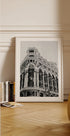 Una raffinata fotografia in bianco e nero del negozio Prada in Galleria Vittorio Emanuele II a Milano, incorniciato da un'architettura decorata e dall'iconico pavimento a mosaico. Questa stampa unisce moda e storia, esprimendo l'eleganza italiana e lo stile senza tempo, perfetto per interni ispirati alla cultura, al lusso e al design.