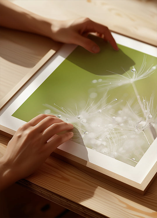 Green di Hilde Ghesquiere è un macro look calmo, dove gocce d'acqua cristalline si bilanciano su una sottile piuma bianca e brillano come piccole perle in una nebbiosa e morbida luce verde. Il motivo minimalista cattura il dramma silenzioso della natura e crea un'atmosfera poetica e meditativa che invita alla presenza e alla calma. Perfetto per un look calmo e scandinavo.