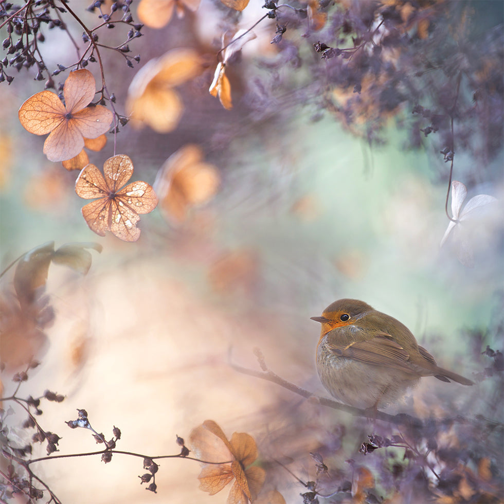 La fantasia Hydrangea di Teuni raffigura una piccola rossa tra le ortensie baciate dal gelo, immersa in un morbido bokeh e una leggera neve. I colori pastello e la luce soffusa conferiscono al motivo un'aura sognante e avventurosa, dove la poesia della natura incontra la silenziosa magia dell'inverno e invita alla tranquillità all'interno. Un poetico eye-catcher per gli animi botanici.