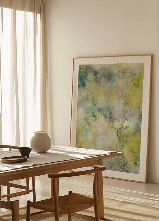 Una delicata opera d'arte impressionista che fonde forme botaniche con morbide trame pittoriche. Delicate sfumature di verde, blu e giallo dorato creano un'atmosfera sognante e tranquilla che cattura la fugace bellezza della natura. Perfetto per aggiungere un'atmosfera rilassante e artistica a qualsiasi stanza