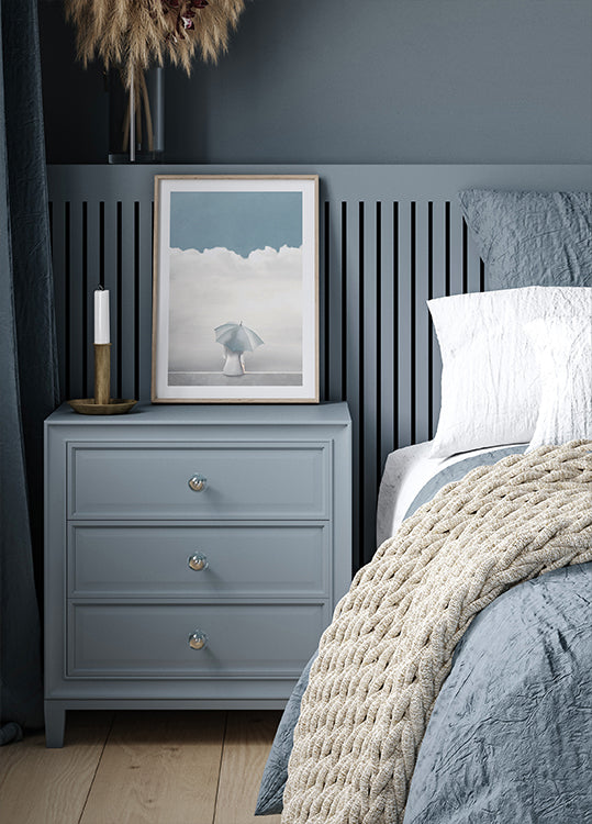 Un'opera d'arte calma e poetica raffigurante una figura solitaria seduta sul bordo con un ombrello azzurro in mano, lo sguardo rivolto al cielo. Le nuvole si addensano in alto, creando un'atmosfera tranquilla e meditativa. Questa composizione minimalista e sognante evoca sentimenti di desiderio, solitudine e calma riflessione. Perfetta per interni moderni, spazi di meditazione e per chi apprezza la serenità artistica.