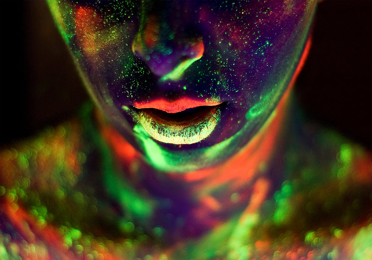 Un ritratto sorprendente che brilla sotto la luce UV, dove i colori al neon trasformano il volto in una tela cosmica. Verdi vibranti, rossi ardenti e gialli brillanti illuminano la pelle e creano una miscela surreale di mistero e intensità. Questa audace opera d'arte celebra il colore, la luce e la forza umana.